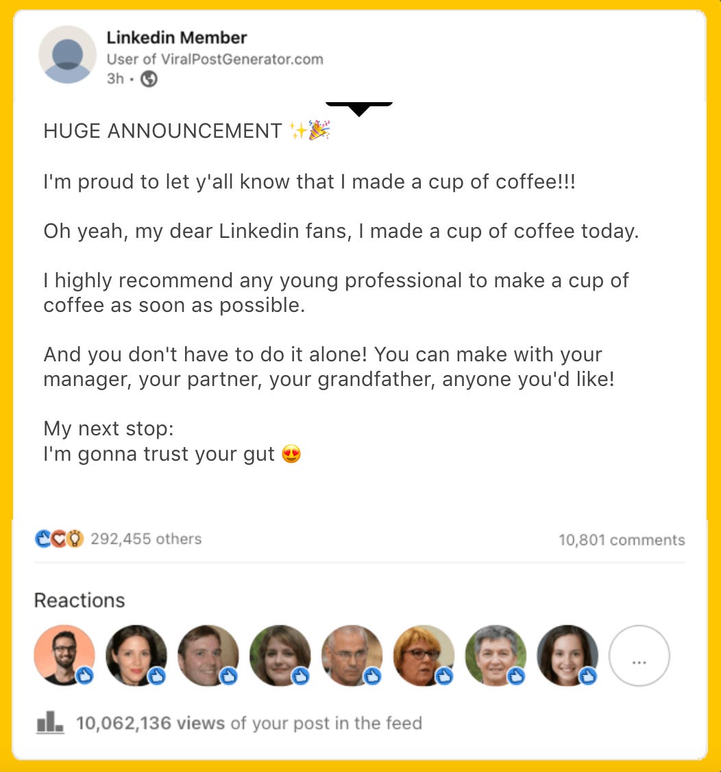 And finally, do you just wish you could also use LinkedIn as a way to build your thought leader career around inane observations leveled up into grandiose pronouncements on the universe? Well, lucky for you, there’s a Viral Post Generator just for you! (And thank you to SO many of you who sent me this, it’s like you know me or something ;) )